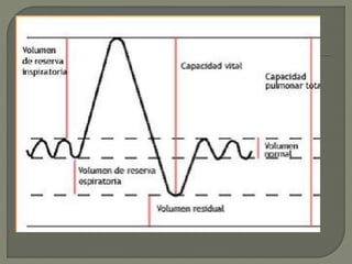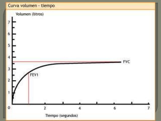 El documento describe las pruebas de espirometría, que miden los volúmenes y flujos de aire en los pulmones. La espirometría forzada mide la capacidad vital forzada y otros parámetros después de una inspiración máxima y espiración forzada. La gasometría mide los niveles de oxígeno, dióxido de carbono y pH en la sangre arterial o venosa para evaluar la oxigenación y equilibrio ácido-base.