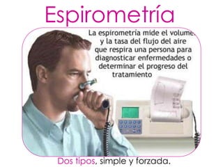 Este documento describe la espirometría, incluyendo dos tipos (simple y forzada). Describe los componentes de un espirómetro y cómo se realiza la prueba. Explica los parámetros medidos en una espirometría simple como el volumen corriente, volúmenes de reserva inspiratoria y espiratoria, y capacidad vital. También cubre los parámetros medidos en una espirometría forzada como el volumen espiratorio forzado, capacidad forzada, y la relación VEF/CVF.