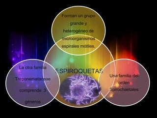 Este documento resume las características de tres géneros de espiroquetas: Treponema, Borrelia y Leptospira. Treponema pallidum causa sífilis, mientras que Borrelia burgdorferi y Leptospira causan enfermedad de Lyme y leptospirosis respectivamente. Detalla su morfología, cultivo, patología, diagnóstico y tratamiento.