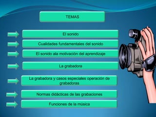 Este documento contiene información sobre el sonido, sus cualidades fundamentales como la intensidad, el tono y el timbre. También describe cómo el sonido motiva el aprendizaje y el papel de la grabación a través de la grabadoras. Finalmente, resume las funciones de la música como un arte para expresar sentimientos a través de la melodía, armonía y ritmo que afecta la percepción del individuo.