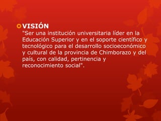 La visión de la institución es ser líder en educación superior y soporte científico-tecnológico para el desarrollo de la provincia de Chimborazo y del país. Su misión es formar profesionales competitivos y emprendedores comprometidos con la justicia social a través de la generación y aplicación del conocimiento. Los objetivos incluyen lograr una administración eficiente, establecer una organización flexible para responder a las expectativas sociales, y fortalecer el modelo educativo.