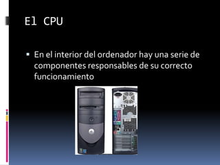 El documento describe las 10 partes internas principales del CPU. Estas incluyen la fuente de poder, lector de CD, procesador, grabador de DVD, memoria RAM, memoria central, disco duro, tarjeta madre, tarjeta de video y tarjeta de sonido. Cada una juega un papel importante en el funcionamiento general del ordenador.