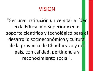 Este documento presenta la visión, misión, objetivos y fines de la Escuela Politécnica del Chimborazo (ESPOCH). La visión es ser una institución líder en educación superior y soporte científico-tecnológico para el desarrollo de la provincia de Chimborazo y del país. La misión es formar profesionales competitivos, emprendedores y conscientes de su identidad nacional a través de la generación y aplicación del conocimiento. Los objetivos incluyen lograr una administración eficiente, estable