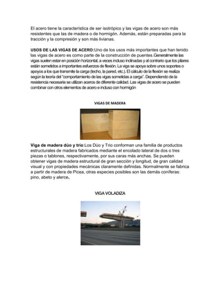 Las vigas son elementos estructurales lineales que trabajan principalmente a flexión y soportan y transmiten pesos y tensiones. Suelen estar en posición horizontal y están hechas de materiales como madera, acero u hormigón armado. Cumplen la función vital de soportar cubiertas y transmitir cargas a la cimentación en construcciones como puentes, edificios y más.