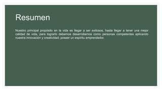 El documento describe el espíritu emprendedor y su importancia. Define el espíritu emprendedor como el desarrollo de proyectos innovadores para obtener un beneficio e incluye valores como la creatividad y la confianza en uno mismo. Explica que el espíritu emprendedor es fundamental para acceder al empleo y el desarrollo económico de una sociedad.