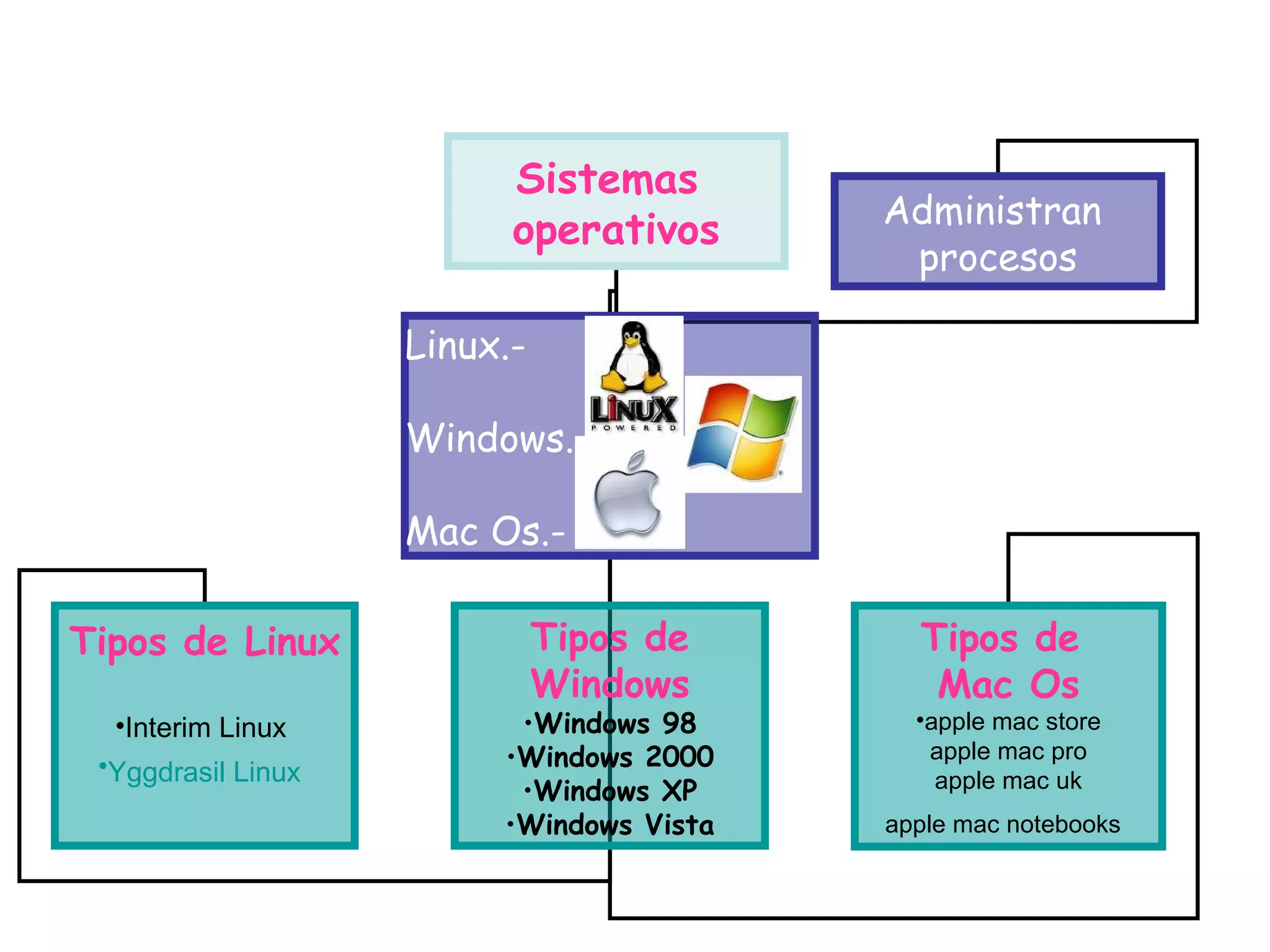 El documento describe los principales sistemas operativos Linux, Windows y Mac Os, incluyendo algunos tipos específicos de cada uno. También proporciona información sobre las versiones de Windows, con detalles sobre el lanzamiento y las ventajas y desventajas de Windows XP.