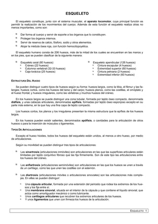 El esqueleto humano está formado por 206 huesos que cumplen funciones como permitir el movimiento, dar forma al cuerpo, proteger órganos y almacenar minerales. El esqueleto se divide en axial (cráneo, columna, caja torácica) y apendicular (extremidades y cinturas). Los huesos se unen mediante articulaciones móviles, semimóviles e inmóviles.