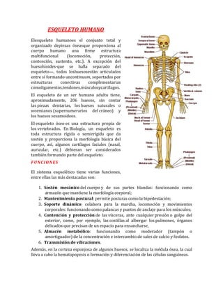 El esqueleto humano está compuesto por aproximadamente 206 huesos que proporcionan estructura y soporte al cuerpo. El esqueleto se divide en axial, que incluye los huesos de la columna vertebral, cráneo y tórax, y apendicular, que incluye los huesos de las extremidades. El esqueleto cumple funciones como soporte, protección de órganos, almacenamiento y locomoción.