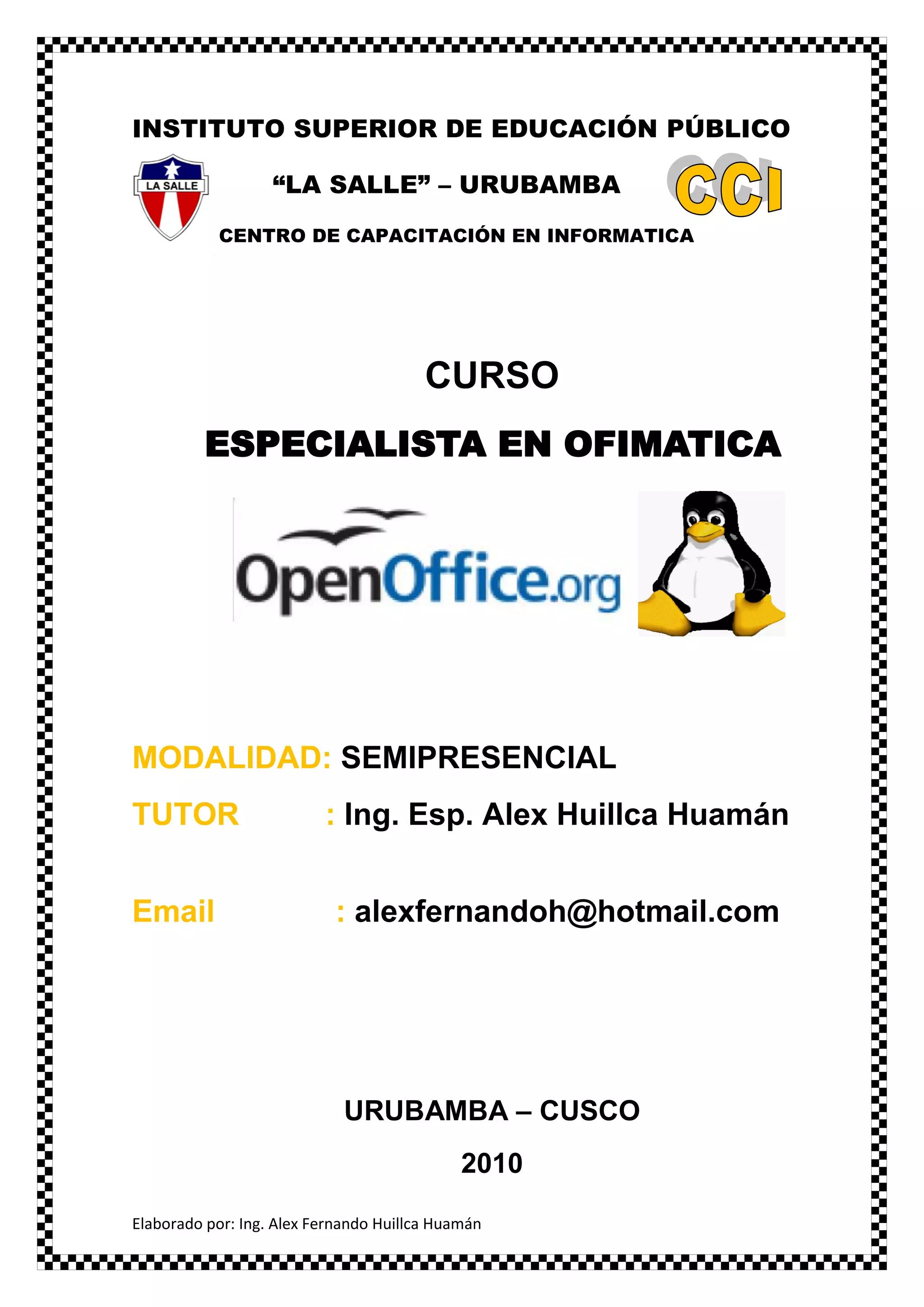 Este documento describe un curso semipresencial sobre la suite ofimática OpenOffice. El curso se enfoca en enseñar las habilidades necesarias para crear documentos, hojas de cálculo y presentaciones con OpenOffice. El curso está dirigido a docentes y estudiantes egresados de computación e informática y consta de varias unidades sobre el sistema operativo Linux y las herramientas de OpenOffice como Writer, Calc e Impress.
