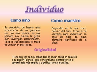 El docente se describe a sí mismo como alguien curioso que busca constantemente nueva información para mejorar su enseñanza. Le gusta leer e investigar para encontrar nuevas formas creativas de explicar los temas a sus estudiantes y mantenerlos interesados, aunque también se apoya en métodos más tradicionales si es necesario. Su objetivo es establecer conexiones significativas entre el contenido y la experiencia de los estudiantes para facilitar la comprensión.