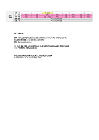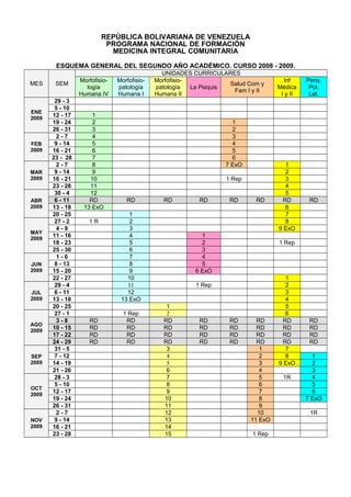 Este documento presenta el esquema general del segundo año académico del Programa Nacional de Formación en Medicina Integral Comunitaria de la República Bolivariana de Venezuela para el curso 2008-2009. Incluye las unidades curriculares, las fechas de cada mes académico y las leyendas explicativas.