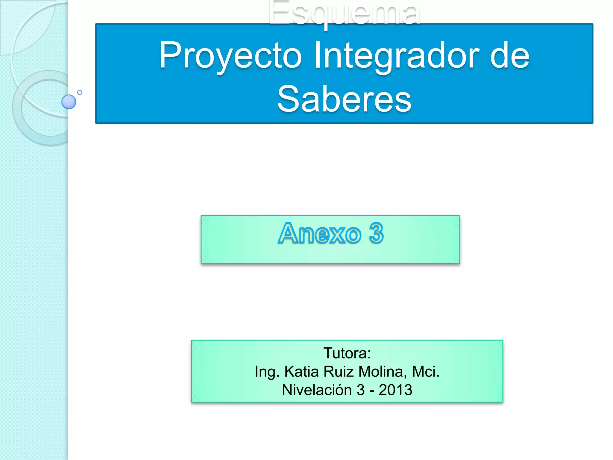Este documento presenta la estructura sugerida para un Proyecto Integrador de Saberes. Propone incluir una introducción, desarrollo, conclusiones, bibliografía y anexos. El desarrollo se dividiría en tres secciones principales: 1) contextualización y definición de la problemática, 2) análisis conceptual y formulación de hipótesis, y 3) metodología y resultados de la investigación. El objetivo es que los estudiantes desarrollen un proyecto que integre de manera sistémica los conocimientos adquiridos