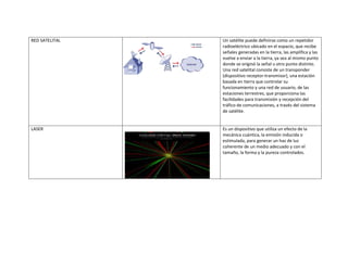 Este documento resume brevemente 5 tipos de medios de transmisión de datos: fibra óptica, que transmite pulsos de luz a través de hilos de vidrio o plástico; radiofrecuencia, que transmite ondas electromagnéticas entre 3 kHz y 300 GHz; microondas, con frecuencias entre 300 MHz y 300 GHz; redes satelitales, que usan satélites para recibir y retransmitir señales entre la Tierra y puntos de recepción; y láseres, que generan haces coherentes de luz usando emisión