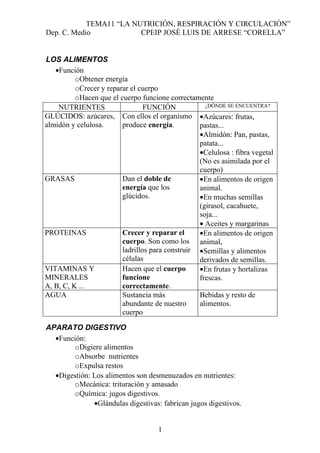 Este documento describe los sistemas de nutrición, respiración y circulación del cuerpo humano. Explica las funciones del aparato digestivo, respiratorio y circulatorio, así como los nutrientes esenciales, los órganos involucrados y sus funciones. También describe el recorrido de la sangre a través del corazón y los vasos sanguíneos, así como el intercambio de gases en los pulmones y los tejidos.