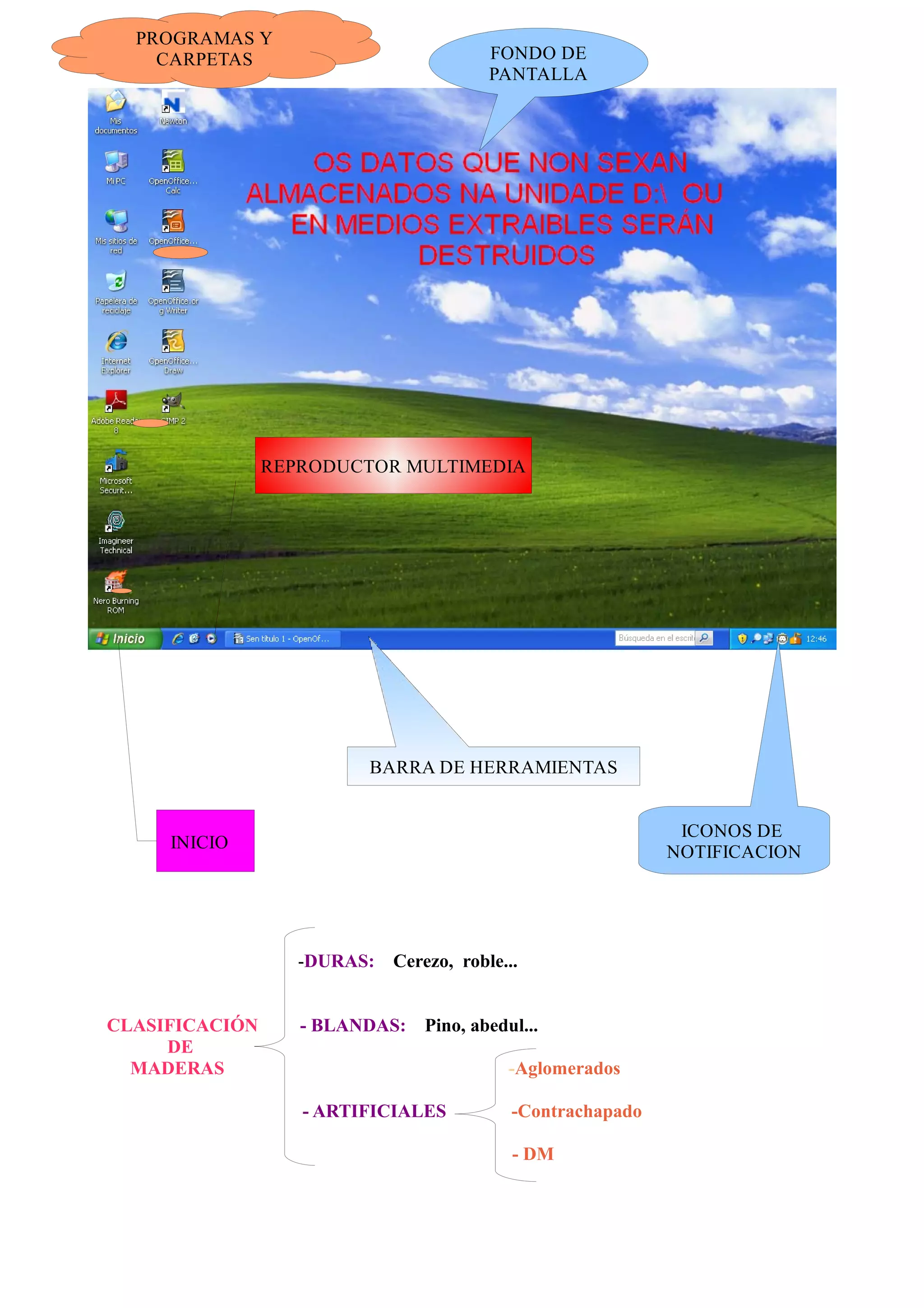 El documento clasifica diferentes tipos de maderas en categorías como duras, blandas, artificiales y aglomerados/contrachapado/DM. Proporciona una lista de ejemplos como cerezo y roble para maderas duras y pino y abedul para maderas blandas.