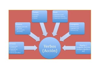 Este documento resume los elementos fundamentales de la conjugación de verbos en español, incluyendo el tiempo (presente, pasado, futuro), modo (indicativo, subjuntivo, imperativo), número (singular, plural), persona (primera, segunda, tercera), y si un verbo es regular o irregular.