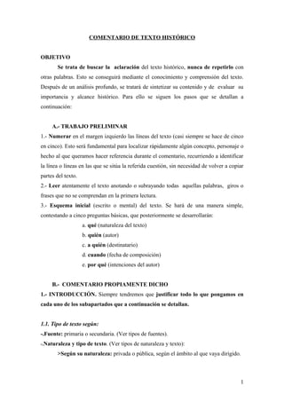 Este documento proporciona instrucciones para comentar un texto histórico. Sugiere un proceso de tres pasos: 1) trabajo preliminar como numerar líneas y esquematizar el texto, 2) comentario que incluye tipo de texto, autor, fecha, contenido e implicaciones históricas, y 3) conclusión sobre la autenticidad y relevancia del texto y su contribución al conocimiento histórico.