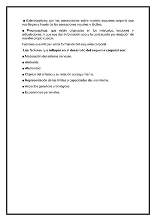 El esquema corporal se define como el conocimiento y la representación que una persona tiene de su propio cuerpo, que se desarrolla a lo largo de la vida influenciado por la maduración neurológica y experiencias acumuladas. La comprensión plena del esquema corporal generalmente se alcanza entre los 11 y 12 años, a través de sensaciones interoceptivas, exteroceptivas y propioceptivas. Diversos factores, como la maduración del sistema nervioso, el ambiente y las experiencias personales, afectan su desarrollo.