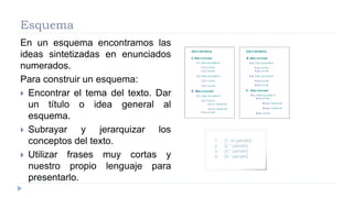 El documento describe tres herramientas para organizar la información: el esquema, que presenta ideas numeradas en enunciados cortos; el cuadro sinóptico, que muestra las ideas principales y secundarias de forma jerárquica; y el mapa conceptual, que vincula conceptos mediante líneas y palabras de enlace para facilitar el aprendizaje significativo. Se explican los pasos para construir cada herramienta y se mencionan programas gratuitos para crear mapas conceptuales en línea o en la computadora.
