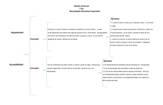 Este documento habla sobre el diseño universal y las necesidades educativas especiales, con ejemplos de cómo la adaptabilidad y la accesibilidad pueden apoyar a los estudiantes. Se mencionan tres ejemplos de cómo un estudiante podría necesitar apoyo al entrar a una nueva escuela, hablar en público, o empezar un trabajo. También se dan tres ejemplos de accesibilidad como estacionamientos especiales, tecnología accesible, y rampas en buen estado.