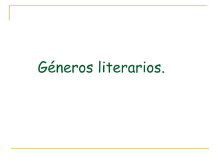 El documento presenta un esquema de los principales géneros literarios, dividiéndolos en tres categorías: épico o narrativo (que incluye la epopeya, el cantar de gesta, el cuento y la novela), lírico (que comprende la canción, la elegía y la oda) y dramático o teatral (con la tragedia, el drama y la comedia).