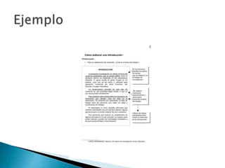 Este documento proporciona instrucciones para la elaboración de un informe de investigación. Explica que el informe debe incluir una introducción con el tema, propósito y metodología; objetivos generales y específicos; una justificación del estudio; una revisión de literatura; un marco práctico; conclusiones basadas en los objetivos; y recomendaciones y limitaciones.