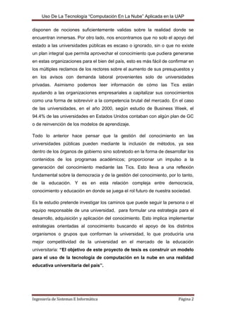 Este documento describe el problema de la falta de uso de tecnologías como la computación en la nube en las universidades públicas peruanas, específicamente la Universidad Alas Peruanas. El autor propone investigar en qué medida el uso de la computación en la nube puede ayudar a mejorar el rendimiento académico de los estudiantes. Explica los antecedentes teóricos y el marco conceptual de la computación en la nube y justifica la importancia de la investigación para mejorar la educación y la competitividad de los estudiantes y la universidad