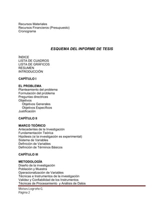 Este documento presenta los esquemas para la presentación del perfil y el informe de proyecto de graduación. Incluye la estructura y descripción de cada capítulo que deben contener, como la introducción, el problema de investigación, el marco teórico, la metodología, los resultados, las conclusiones y la propuesta. Además, proporciona pautas y observaciones para cada sección con el fin de orientar al estudiante en la elaboración de su trabajo de graduación.