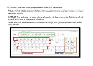 Este documento proporciona una guía de las funciones de las teclas del teclado de una computadora. Explica que la tecla ESC sirve para salir de menús y sitios, la tecla TAB se usa para realizar acciones en editores de texto, y la tecla SUPR borra el carácter a la derecha del cursor. También describe los usos de las teclas CTRL, ALT y WINDOWS para acceder a menús y funciones, y explica que las teclas de función F1 a F12 sirven como atajos para acceder rápidamente a funciones de programas.