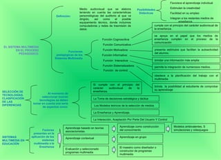 El documento habla sobre los sistemas multimedia en el proceso pedagógico. Explica que los sistemas multimedia cumplen funciones pedagógicas como la motivación, información, interacción y sistematización. También describe diferentes tipos de ambientes de aprendizaje como los virtuales, lúdicos y basados en la estética social. Finalmente, analiza modelos de enseñanza a distancia centrados en variables como el docente, aprendizaje, tecnología e interacción.