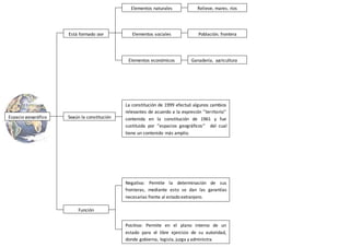 El documento describe el espacio geográfico y la división político-territorial de Venezuela según la Constitución de 1999. Explica que el espacio geográfico incluye elementos naturales como el relieve y ríos, y elementos sociales y económicos como la población y la agricultura. Además, indica que Venezuela se divide en 23 estados y un Distrito Capital, y que cada estado contiene municipios con autogobierno. Finalmente, menciona algunos conflictos limítrofes con países vecinos.