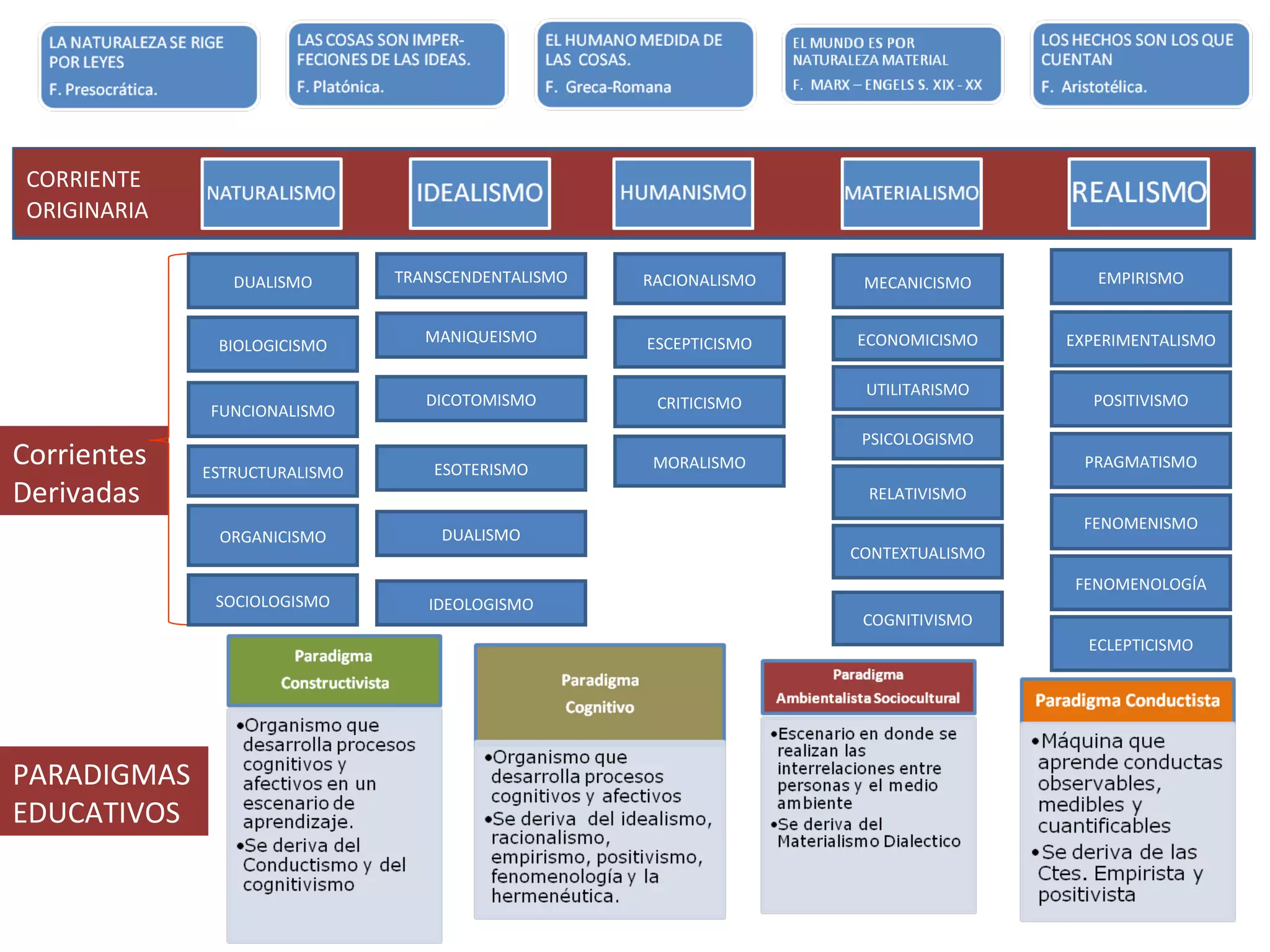 Este documento lista varias corrientes de pensamiento y paradigmas educativos, incluyendo dualismo, organicismo, estructuralismo, funcionalismo, empirismo, experimentalismo, fenomenismo, pragmatismo, positivismo, mecanicismo, economicismo, relativismo, psicologismo, utilitarismo, racionalismo, escepticismo, moralismo, criticismo, trascendentalismo, maniqueísmo, dualismo, esoterismo, dicotomismo, sociologismo, fenomenología, contextualismo, ideologismo, cognitivismo y eclepticismo.