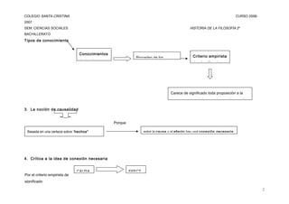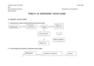 David Hume propuso que todo conocimiento proviene de impresiones sensibles o ideas copiadas de impresiones. Argumentó que no hay una conexión necesaria entre causa y efecto, y criticó las nociones de sustancias, Dios, y el yo. Finalmente, sostuvo que la moral y la religión se basan en sentimientos en lugar de la razón.