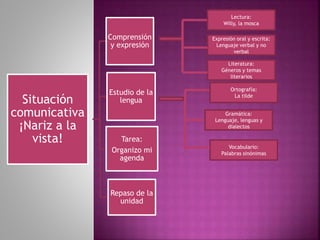 El documento presenta el plan de estudios de una unidad que incluye tareas como organizar una agenda y repasar la unidad, lecturas como "Willy, la mosca", y temas de expresión oral y escrita, literatura, ortografía y gramática como lenguaje verbal y no verbal, géneros literarios, la tilde y lenguajes, lenguas y dialectos. También presenta vocabulario sobre palabras sinónimas.