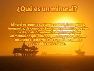 Este documento describe diferentes tipos de minerales, incluyendo minerales metálicos, no metálicos y energéticos. Los minerales metálicos como el hierro y el cobre se forman a través de procesos volcánicos y se extraen principalmente de minas subterráneas. Los minerales no metálicos como las sales y el yeso se originan de restos de plantas y animales y se extraen de minas a cielo abierto. Los minerales energéticos como el petróleo y el gas natural se encuentran