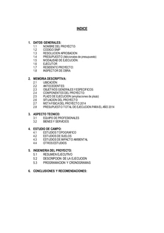 Este documento presenta el plan de trabajo para la ejecución de un proyecto de infraestructura en Moquegua en 2014. Incluye información general del proyecto, objetivos, componentes, cronograma, presupuesto, equipo profesional, bienes y servicios requeridos, y detalles sobre la ingeniería, ejecución y programación de las actividades. El resumen ejecutivo describe el alcance del proyecto y la justificación técnica. Se elaborarán cronogramas y cuadros de avance físico y financiero programado para dar