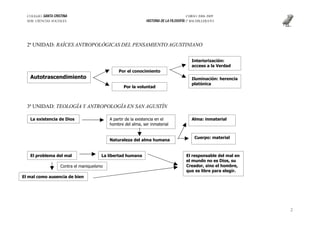 San Agustín de Hipona sintetizó el platonismo cristiano. Defendió que la fe y la razón se complementan y apuntan a una única verdad, en respuesta a los motivos teóricos y históricos de la época. Propuso que el acceso a la verdad se logra a través del conocimiento interior iluminado y de la voluntad, y defendió la existencia de Dios a partir del alma inmaterial del hombre. Explicó el problema del mal como consecuencia de la libertad humana para elegir el bien o su ausencia, rech