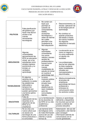 Este documento identifica varios problemas, causas y efectos relacionados con la integración de las tecnologías de la información y la comunicación (TIC) en la educación ecuatoriana. Entre los problemas se encuentran la falta de capacitación de los docentes y acceso a las herramientas tecnológicas, lo que causa desmotivación en los estudiantes y dificultades en el aprendizaje. También se mencionan retos políticos, ideológicos y culturales que impiden aprovechar plenamente las oportunidades educativ