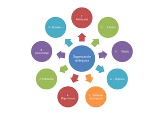El documento describe la organización jerárquica de los seres vivos desde las moléculas hasta la biosfera, con las células como la unidad estructural, funcional y reproductora básica. También describe la estructura y funciones de las células eucariotas y procariotas.