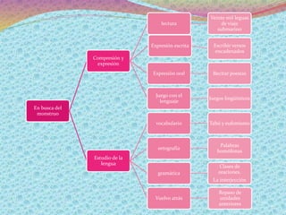 El documento presenta el plan de estudios de lengua y literatura para el 6o curso del año escolar 2013/14. Incluye temas como la comprensión y expresión lectora a través del análisis de obras literarias como "En busca del monstruo" y "Veinte mil leguas de viaje submarino", así como actividades de expresión oral, escrita y juegos con el lenguaje. También cubre el estudio de la lengua a nivel de vocabulario, ortografía, gramática e incluye la revisión de unidades