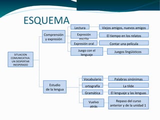 Este documento presenta un esquema de un plan de estudios que incluye varios temas relacionados con el lenguaje y la comunicación. Los temas cubren áreas como la comprensión lectora, la expresión escrita y oral, el vocabulario, la gramática, y el repaso de cursos anteriores. El objetivo general parece ser despertar el interés en el estudio de la lengua a través de diferentes actividades comunicativas.