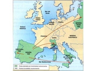 El documento describe las causas de la Revolución Francesa, incluyendo el inmovilismo social, las reivindicaciones de la burguesía, el crecimiento de la población, las ideas de la Ilustración, y la crisis económica. Luego resume los eventos clave de la Revolución, como la toma de la Bastilla, la abolición de los privilegios feudales, y la Declaración de los Derechos del Hombre y del Ciudadano. Finalmente, menciona el establecimiento de la monarquía constitucional y la repúblic