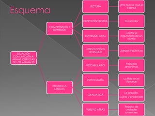 Este documento presenta un resumen de varios temas lingüísticos relacionados con el estudio del lenguaje, incluyendo la comprensión lectora, la expresión escrita y oral, el juego con el lenguaje, el vocabulario, la ortografía, la gramática y la revisión de unidades anteriores.