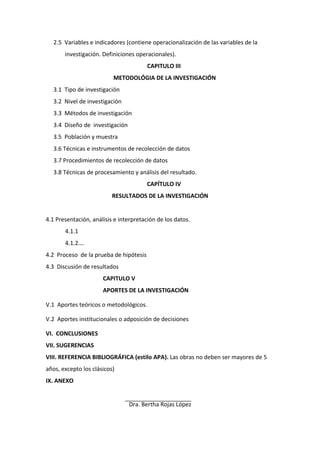 Este documento proporciona las pautas y requisitos para la presentación de una tesis para optar al grado de doctor. Incluye la estructura requerida como la carátula, páginas de dedicatoria y agradecimiento, resumen en inglés de 250 palabras, índice, introducción, marco teórico, metodología, resultados, conclusiones y anexos. Además, detalla los diferentes capítulos que debe contener la tesis relacionados con la formulación del problema, objetivos, marco teórico, metodología
