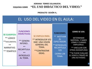 El documento clasifica los videos educativos en cuatro categorías (lúdico, documental, narrativo y temático) y describe sus funciones didácticas como generar interés, recapitular e introducir temas. Explica que los videos se pueden usar para introducir una visión general de un tema, contrastar ideas, motivar a los estudiantes e introducir, recapitular o cerrar un tema. Además, enfatiza la importancia de determinar el material apropiado y saber cómo y cuándo usar los videos, así como vincularlos con otras asignaturas y