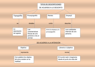Este documento describe diferentes tipos de textos según su estructura y contenido. Explica que los textos pueden ser descriptivos, dialogados, argumentativos o narrativos. Además, detalla las partes comunes de los textos argumentativos, expositivos y narrativos como la introducción, desarrollo y conclusión. Finalmente, analiza los tipos de descripciones que pueden usarse de acuerdo a lo descrito y la intención.