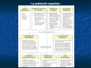 El documento resume los principales conceptos sobre la población española, incluyendo las fuentes demográficas, la distribución geográfica, los regímenes y movimientos demográficos, las migraciones internas e internacionales, y la estructura actual y futura de la población española. Explica factores como la natalidad, mortalidad, esperanza de vida y cómo han cambiado a lo largo de la historia, dando forma a la demografía de España.