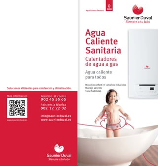 Este documento presenta una guía de selección de calentadores de agua a gas de la marca Saunier Duval. Describe las características y ventajas de la gama de calentadores confort, incluyendo una amplia variedad de tamaños y modelos, como los diseñados para trabajar con energía solar térmica. También incluye tablas comparativas de los modelos disponibles y recomendaciones sobre el calentador adecuado según el número de puntos de demanda y personas en una vivienda.