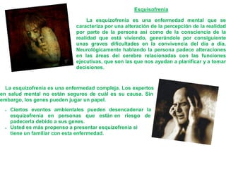 La esquizofrenia es una enfermedad mental caracterizada por alteraciones en la percepción de la realidad y la consciencia. No se conoce la causa exacta pero los genes juegan un papel. Los síntomas incluyen alucinaciones, delirios, trastornos del pensamiento y negativos como apatía. El tratamiento implica medicamentos antipsicóticos además de terapia.