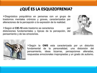 Este documento trata sobre la esquizofrenia. Se define como un trastorno mental crónico caracterizado por distorsiones en la percepción, el pensamiento y las emociones. Puede presentarse en edades prepuberales. Los síntomas incluyen pensamiento desorganizado, delirios, alucinaciones y conducta inapropiada. Tiene un componente genético y factores ambientales también juegan un papel. Los estudios post-mortem han encontrado atrofia cerebral y alteraciones metabólicas y neurolépticos que mejoran los síntomas act
